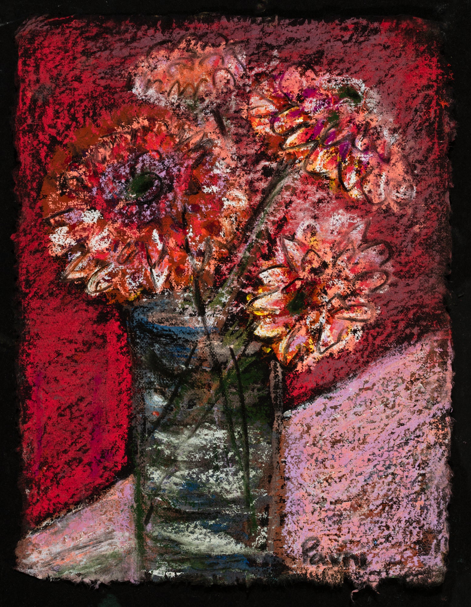 Experimenting in new spaces and new colors, led me to this richly textured painting of Dahlias in the night.