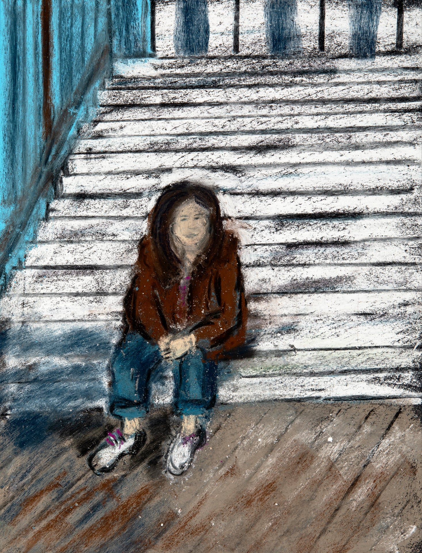 Life Abstracted...Lost in Thought...This series is about capturing moments of precious feelings, simplifying complex state. This soft pastel painting depicts a mom really pensive after leaving kids, lost in thought. Powerful composition, with lines guiding to focal point.
