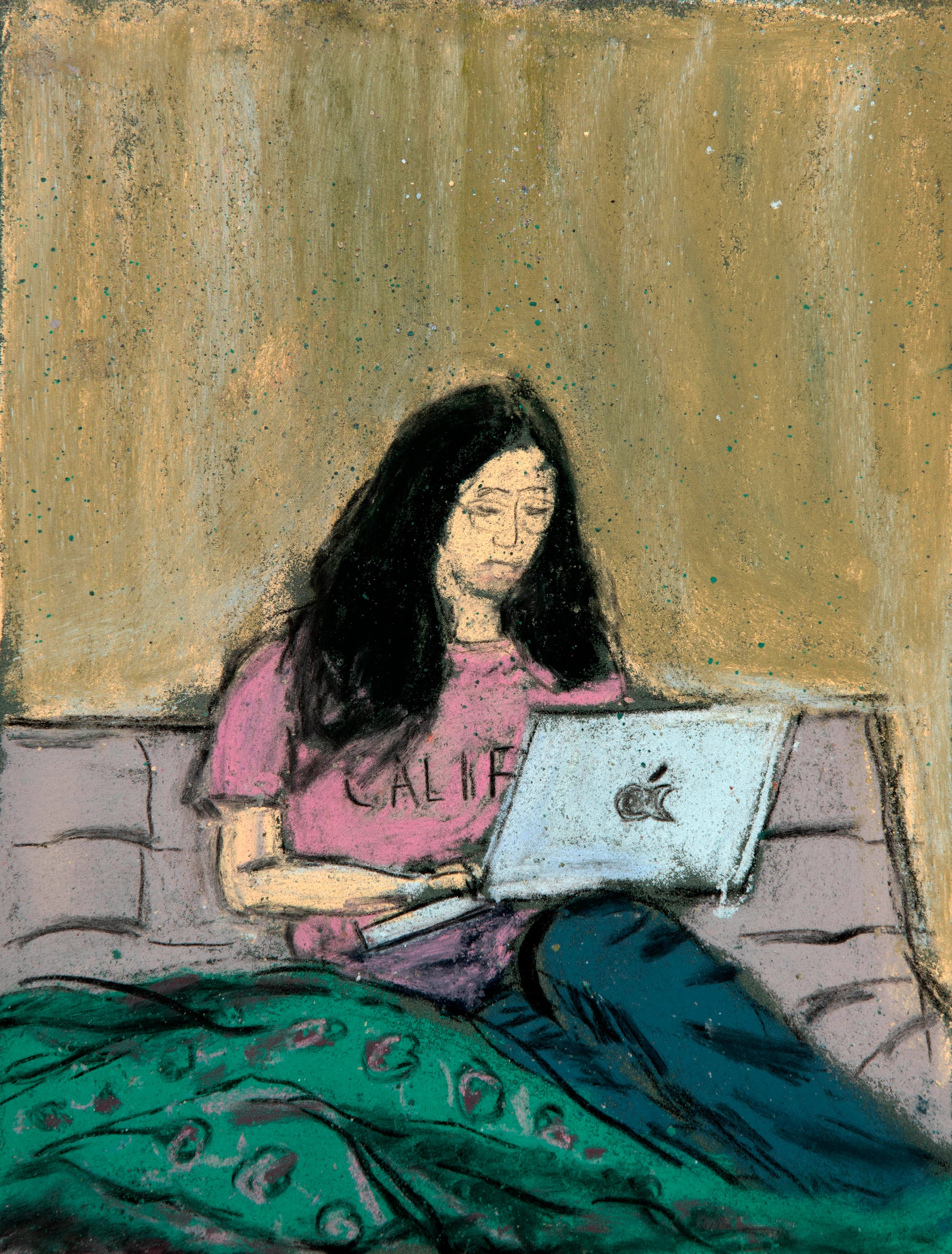 My older daughter is lounging in our family room, engrossed in her homework - a familiar sight captured in pastels with lot of charcoal lines sets the mood. Contrast in the patterned blanket, squares on sofa and just plain wall supports a striking pose.