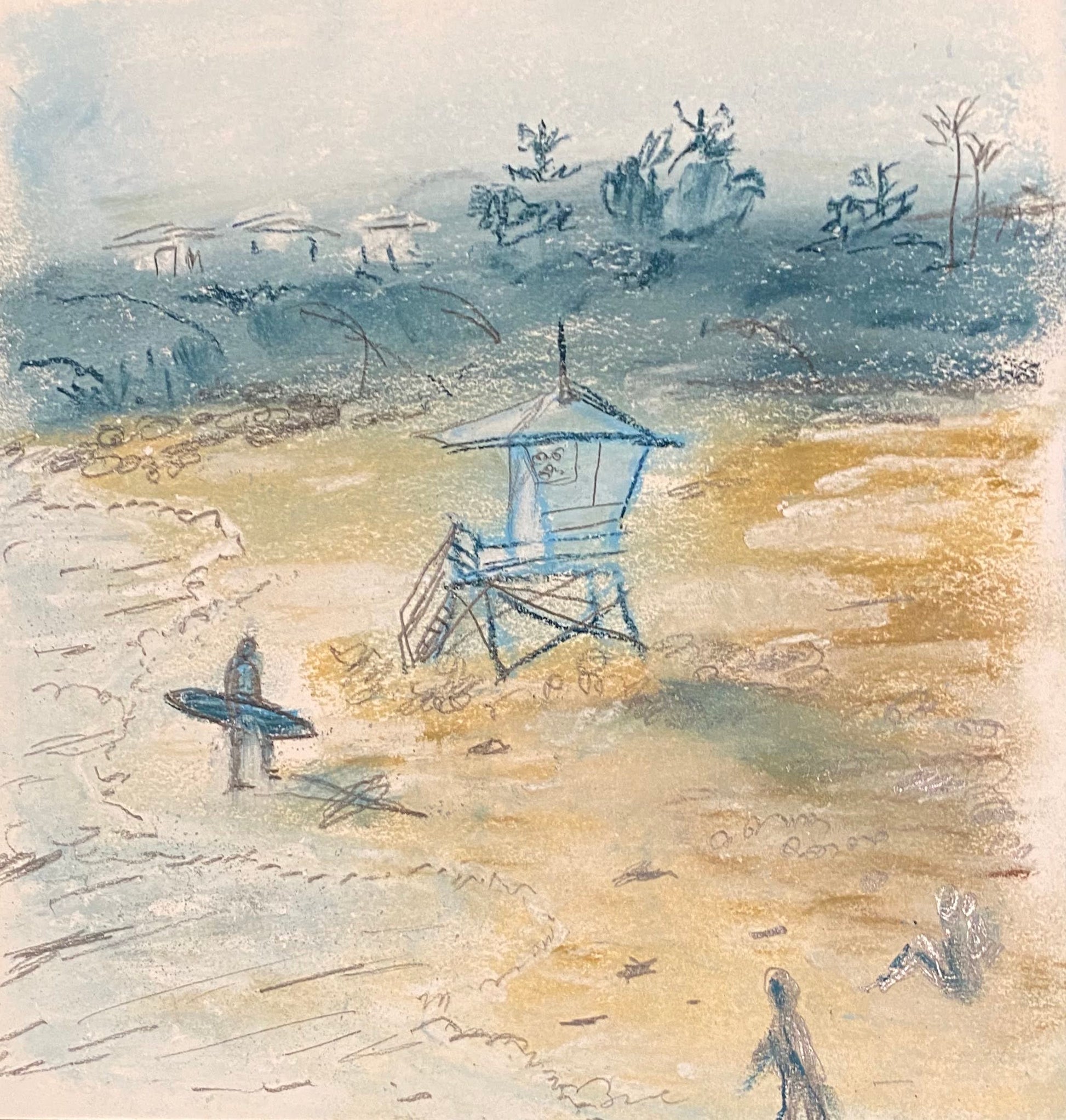 This lifeguard station, this warm sand, this lone surfer, all basking in peaceful glory of this morning quiet at natural bridges beach in santa cruz.Morning quiet at the beach in Santa Cruz.