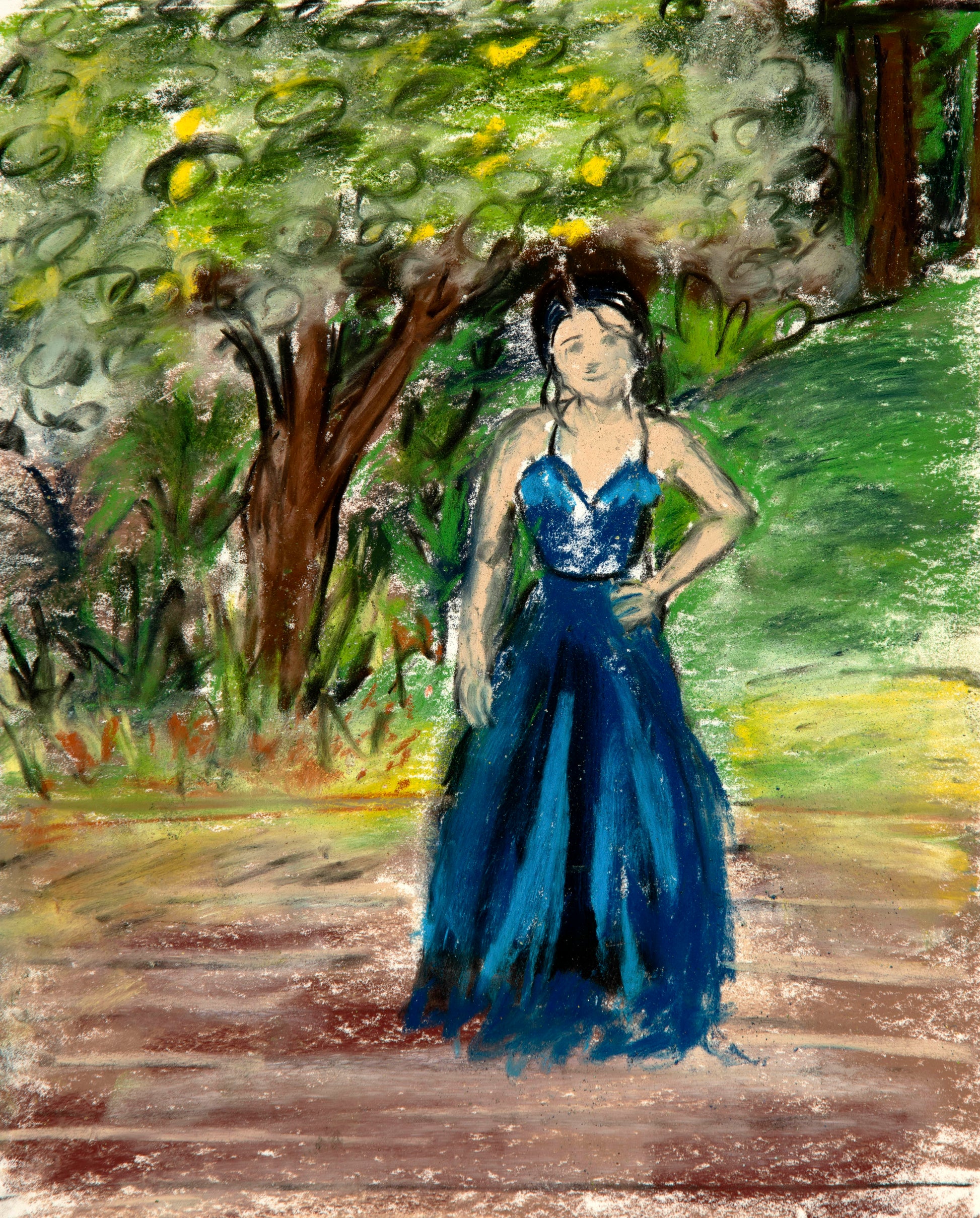Beautiful blue gown and a striking pose form a centerfold of this composition in the backyard. She is indeed ready for prom!