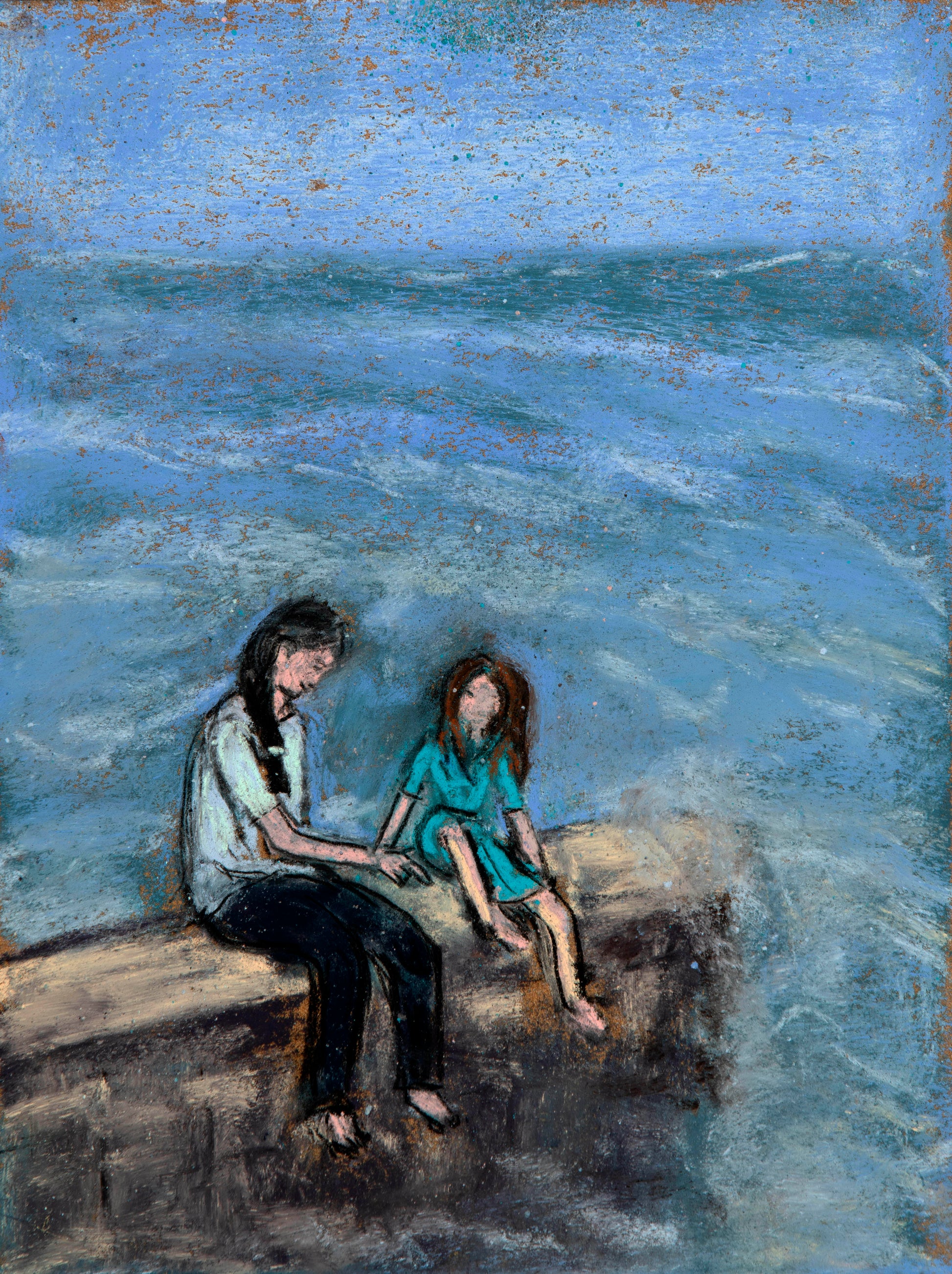 This pastel painting shows two sisters deep in conversation, devoting their full attention to each other while a storm rages on. Painting matches intensity of ocean with that of the conversation focus.