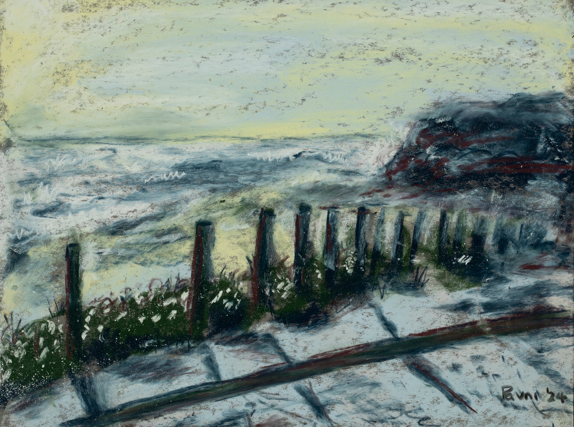 Embrace the dusk magic of the California coast with Evening Shadows. This pastel painting captures the soft glow of evening shadows on a beach near Santa cruz.